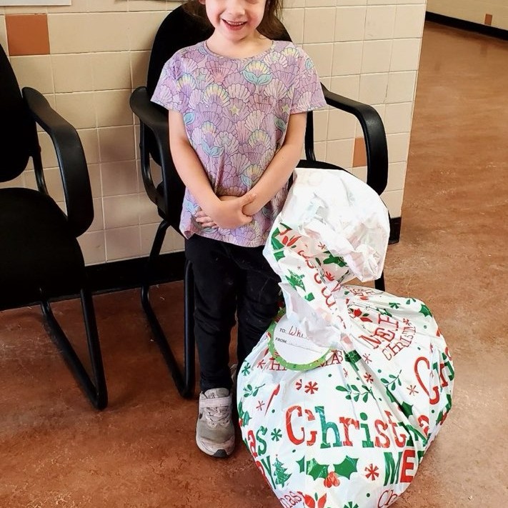 Join us in supporting families identified by school counselors, bringing holiday joy and essential aid through volunteer-driven initiatives. Discover how your involvement creates lasting community impact. One of the happy children receiving a gift bag and gift card.